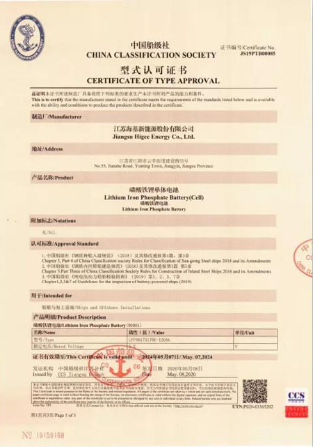 2020年5月,?;履茉戳姿徼F鋰電池產(chǎn)品通過中國船級社(CCS)最新檢測指南《GD22-2019 純電池動力船舶檢驗指南》認(rèn)可和檢驗,該標(biāo)準(zhǔn)發(fā)布日期為2019年12月1日,相對舊標(biāo)準(zhǔn)《GD22-2015 純電池動力船舶檢驗指南》測試內(nèi)容有顛覆性變更,增加了GB36276-2018《電子儲能用鋰離子電池》內(nèi)容。自新標(biāo)準(zhǔn)變更實施以來,我司為首批獲得此認(rèn)可證書的企業(yè)。