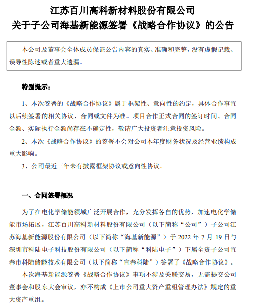 為在電化學儲能領域廣泛開展合作,充分發(fā)揮各自的優(yōu)勢,加速電化學儲能市場拓展, 7月19日,深圳市科陸電子科技股份有限公司下屬全資子公司宜春市科陸儲能技術有限公司與江蘇?;履茉垂煞萦邢薰具_成合作共識并簽署了戰(zhàn)略合作協(xié)議。